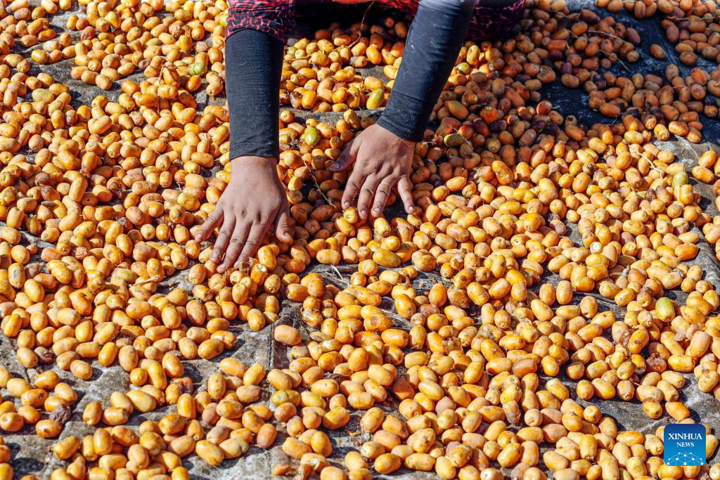 A farmer dries dates at Dahshur village in Giza, Egypt, Aug. 26, 2025. (Xinhua/Ahmed Gomaa)