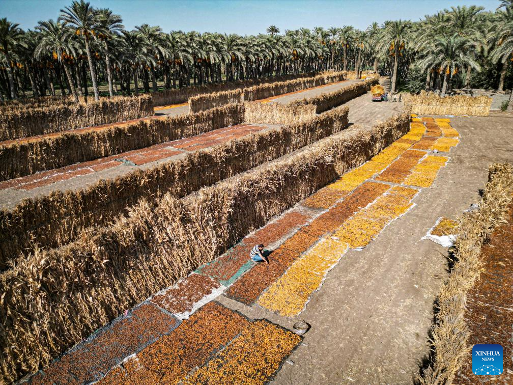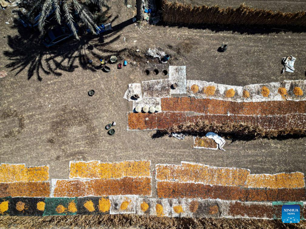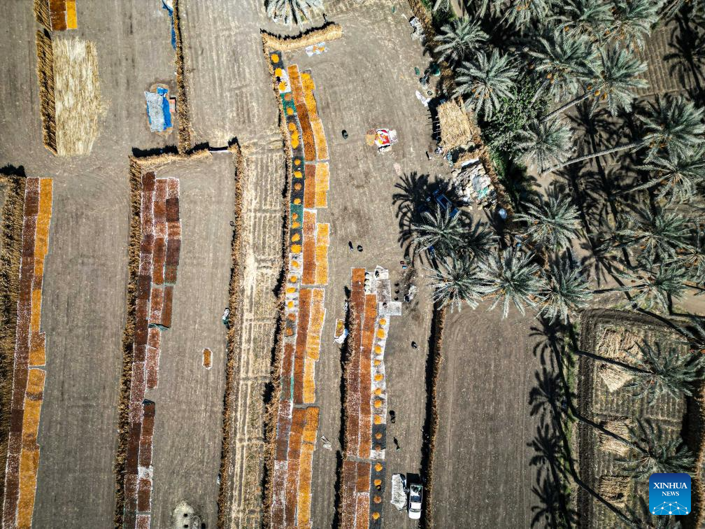 An aerial drone photo taken on Aug. 26, 2025 shows dates dried at Dahshur village in Giza, Egypt. (Xinhua/Ahmed Gomaa)