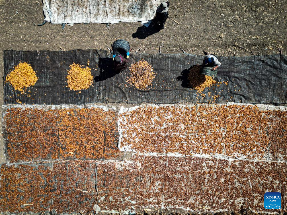 An aerial drone photo taken on Aug. 26, 2025 shows farmers drying dates at Dahshur village in Giza, Egypt. (Xinhua/Ahmed Gomaa)