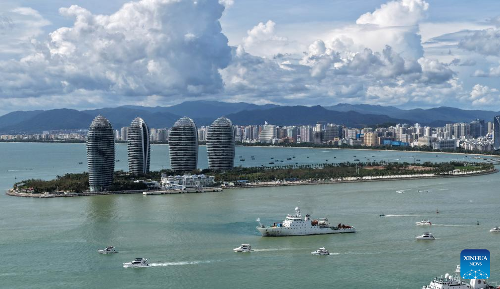 An aerial drone photo taken on Aug. 27, 2025 shows tourists going on a yacht trip for sightseeing in Sanya, south China's Hainan Province. After Typhoon Kajiki swept through, Sanya City has been moving swiftly to restore its tourism market. (Xinhua/Zhao Yingquan)