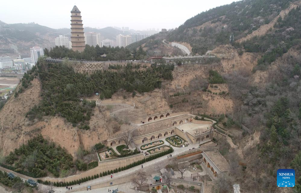 A drone photo taken on March 30, 2021 shows the site of the Yan'an Japanese worker and peasant school in Yan'an, northwest China's Shaanxi Province. (Xinhua/Zhang Bowen)