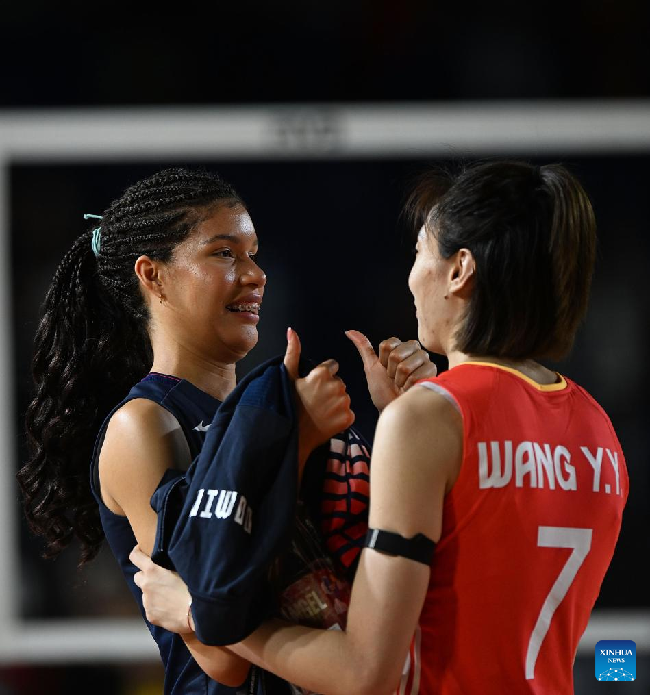 Ni Feifan (L) of China communicates with Brenda Castillo of the Dominican Republic after the Preliminary Phase Pool F match between China and the Dominican Republic at the Volleyball Women's World Championship in Chiang Mai, Thailand, Aug. 27, 2025. (Xinhua/Hou Zhaokang)