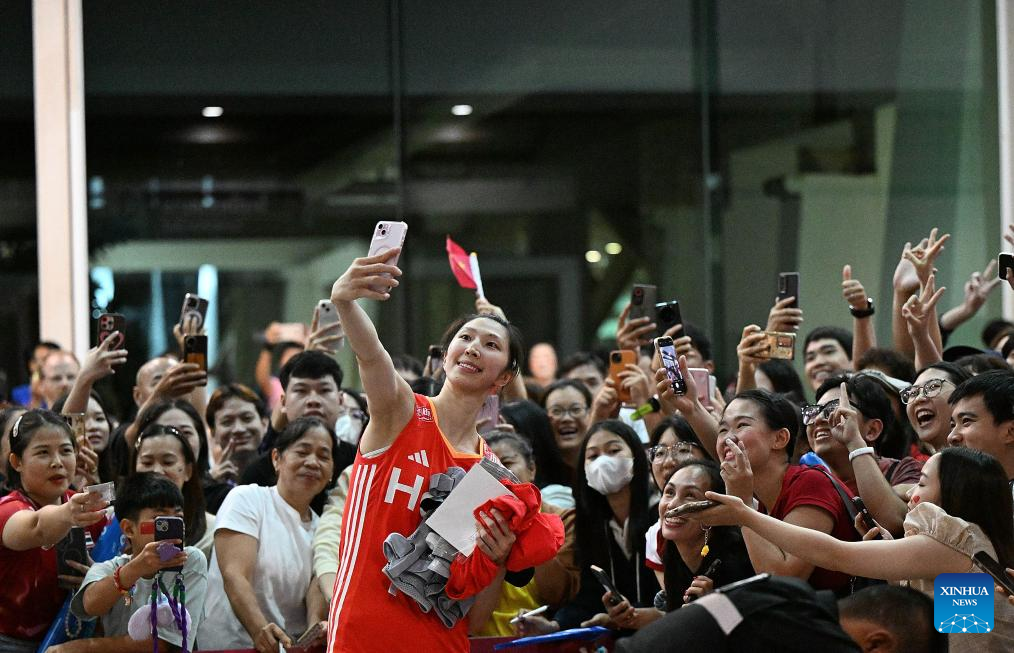 Wu Mengjie (front) of China poses with fans after the Preliminary Phase Pool F match between China and the Dominican Republic at the Volleyball Women's World Championship in Chiang Mai, Thailand, Aug. 27, 2025. (Xinhua/Hou Zhaokang)