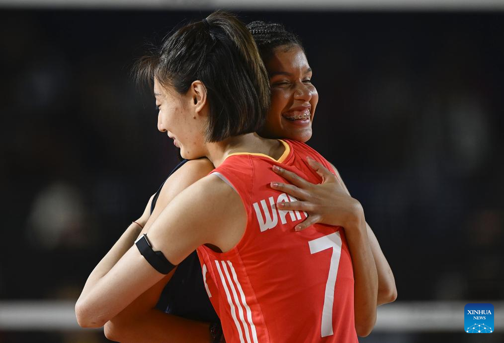 Wang Yuanyuan (front) of China hugs Alondra Denis Tapia Cruz of the Dominican Republic after the Preliminary Phase Pool F match between China and the Dominican Republic at the Volleyball Women's World Championship in Chiang Mai, Thailand, Aug. 27, 2025. (Xinhua/Hou Zhaokang)
