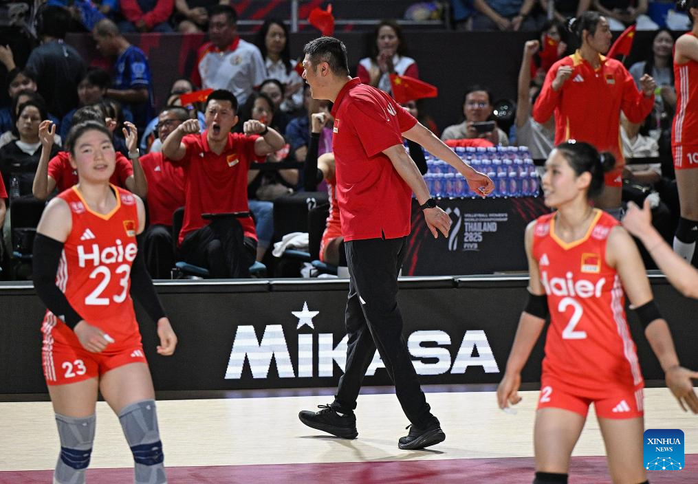 Head coach of China Zhao Yong (C) celebrates during the Preliminary Phase Pool F match between China and the Dominican Republic at the Volleyball Women's World Championship in Chiang Mai, Thailand, Aug. 27, 2025. (Xinhua/Hou Zhaokang)