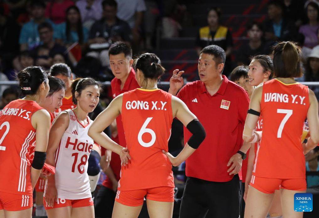 Zhao Yong (4th R), head coach of China instructs players during the Preliminary Phase Pool F match between China and the Dominican Republic at the Volleyball Women's World Championship in Chiang Mai, Thailand, Aug. 27, 2025. (Xinhua/Sun Weitong)