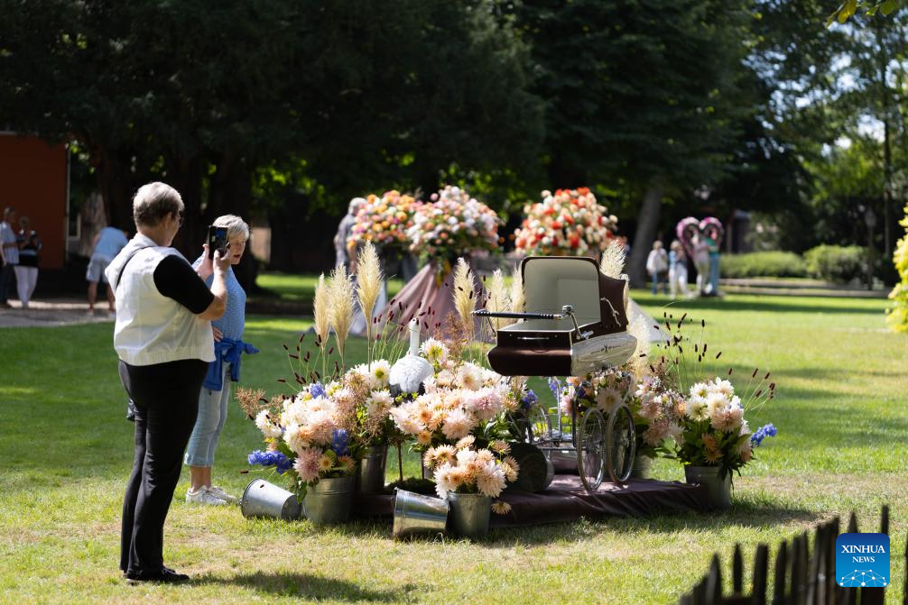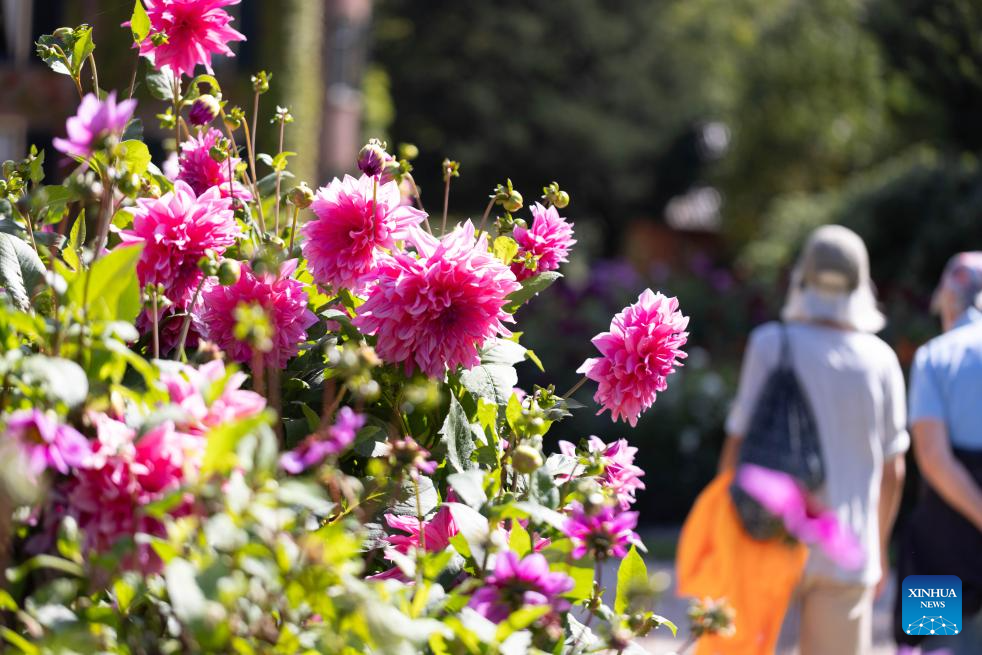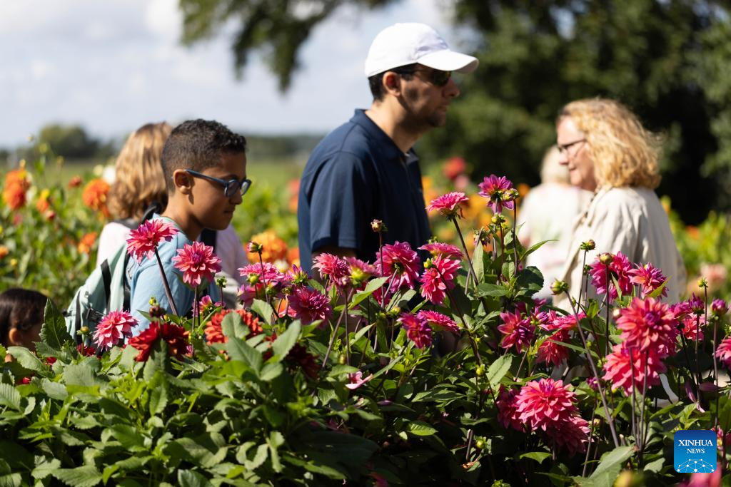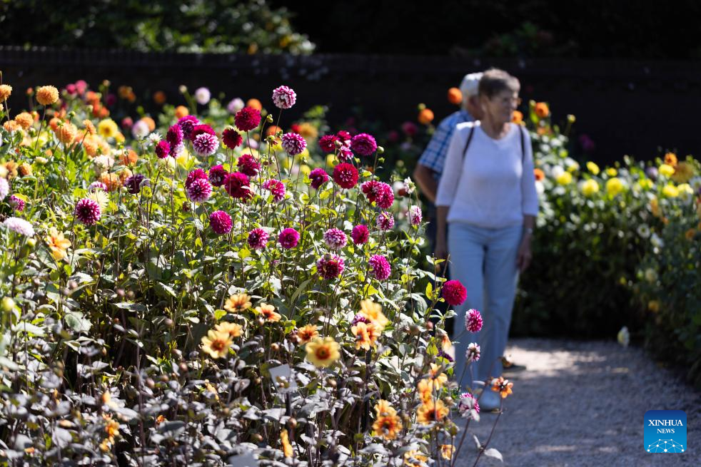 People enjoy blooming dahlias at the garden of Keukenhof Castle during the Keukenhof Dahlia Days event in Lisse, the Netherlands, Aug. 30, 2025.