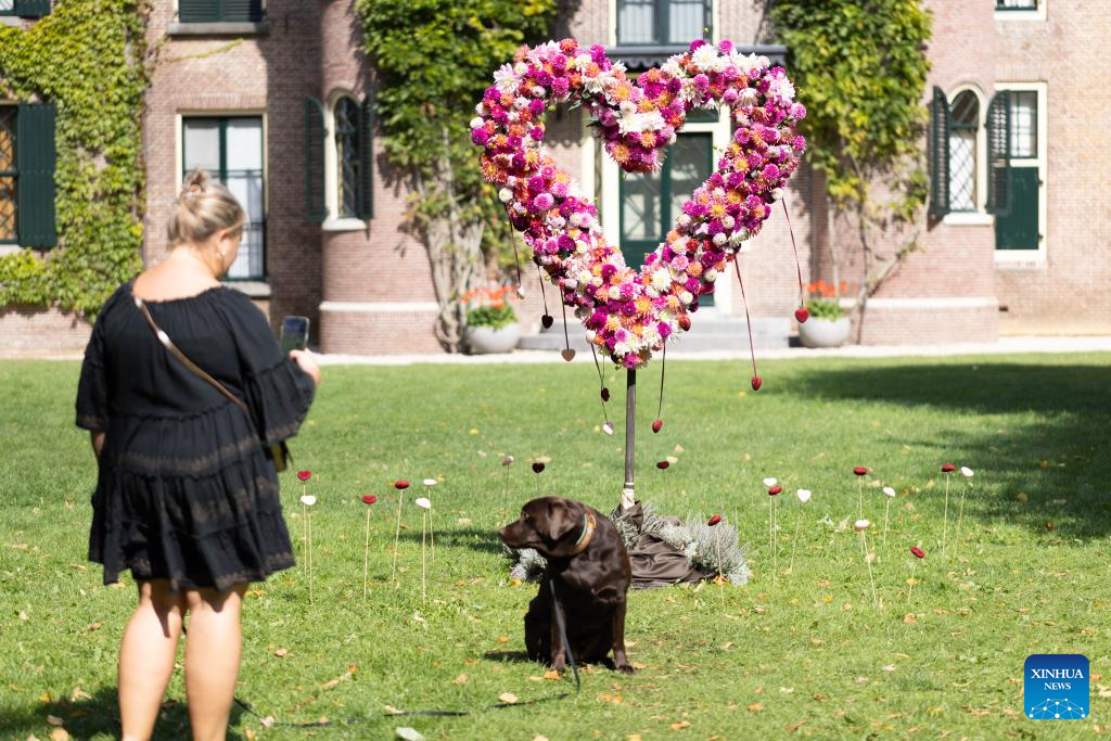 A visitor takes photos of a dog in front of a decoration made of dahlias at the garden of Keukenhof Castle during the Keukenhof Dahlia Days event in Lisse, the Netherlands, Aug. 30, 2025.