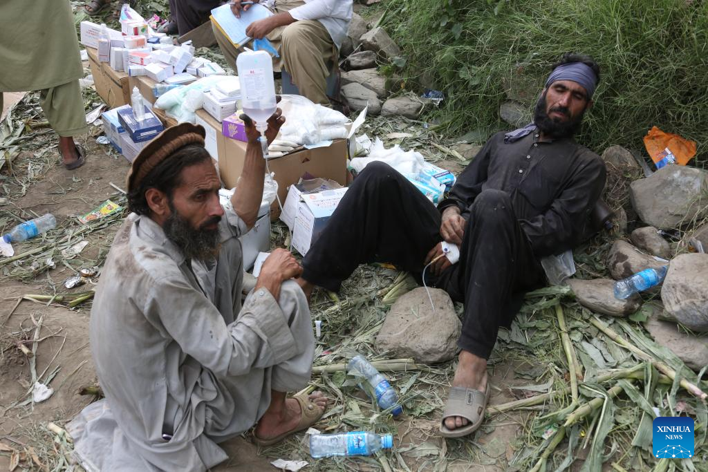 A staff member with the Afghan Red Crescent Society takes care of injured people at the earthquake-hit area in Nurgal district of Kunar province, Afghanistan, Sept. 1, 2025. The death toll from the powerful earthquake that struck eastern Afghanistan has climbed to 1,124, with 3,251 others injured, according to the Afghan Red Crescent Society on Tuesday. (Photo by Saifurahman Safi/Xinhua)