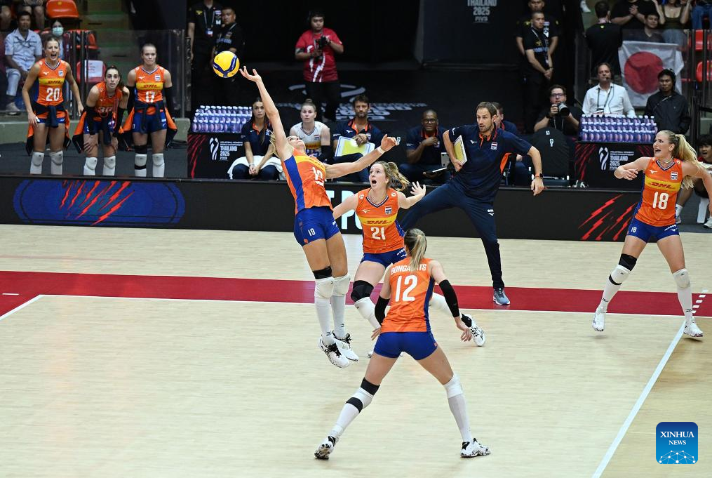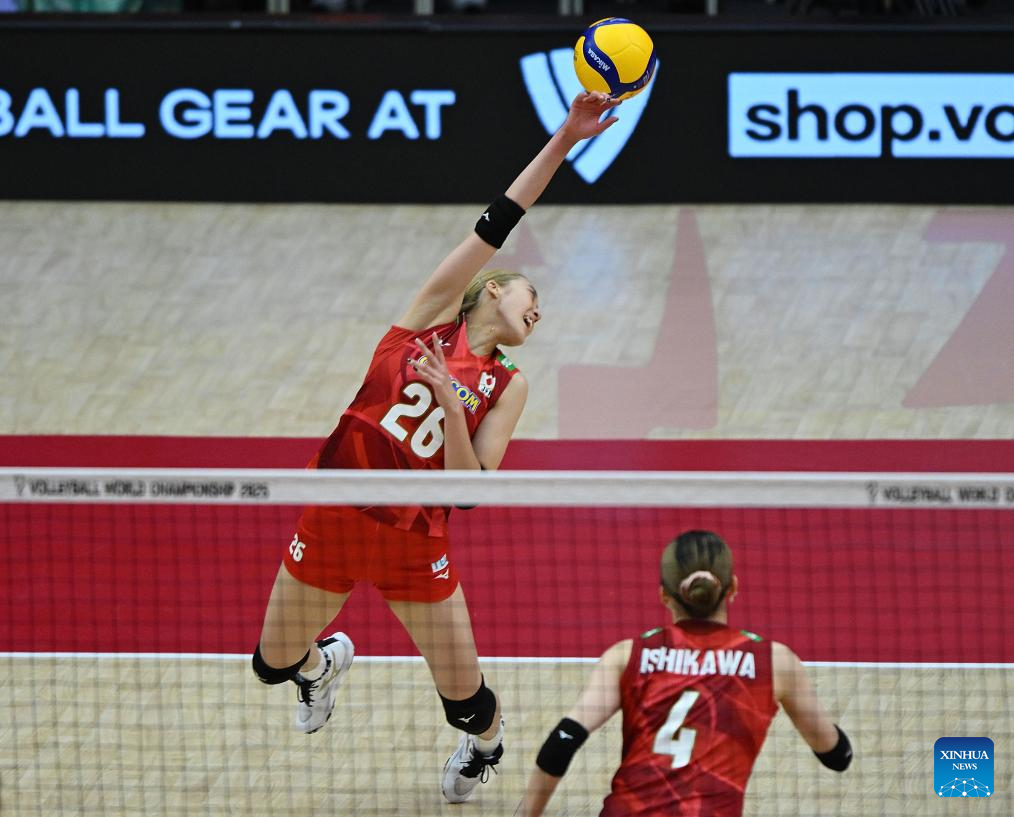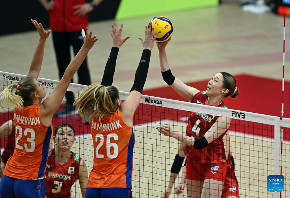 Ishikawa Mayu (R) of Japan competes during the quarterfinal match between the Netherlands and Japan at the Volleyball Women's World Championship in Bangkok, Thailand, Sept. 3, 2025. (Xinhua/Hou Zhaokang)