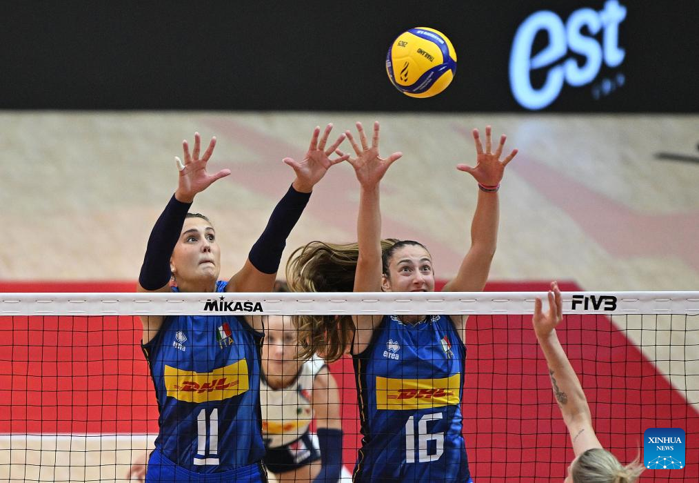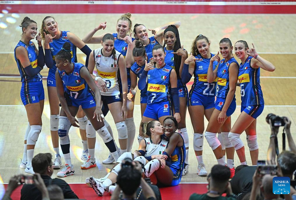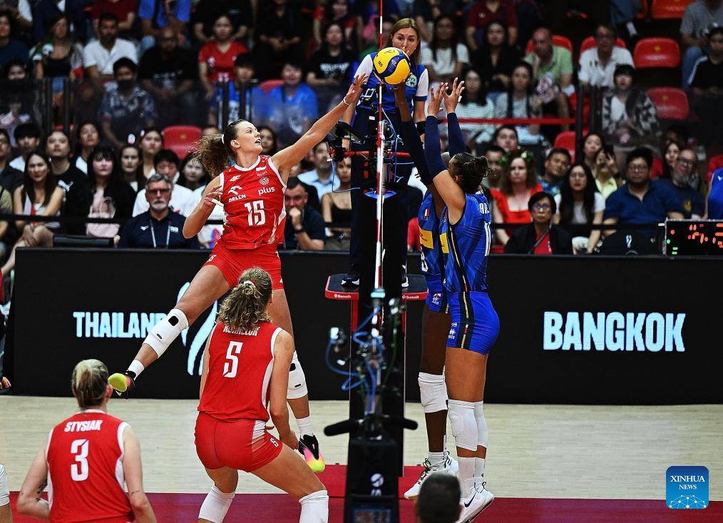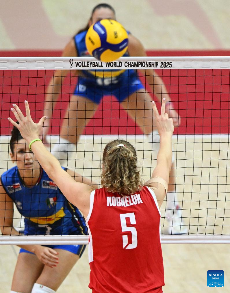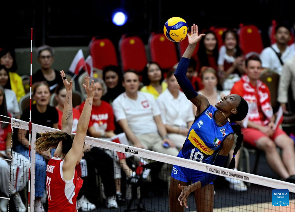 BANGKOK, Sept. 3 (Xinhua) -- Reigning Olympic champion and world No. 1 Italy beat World No. 3 Poland in straight sets here on Wednesday to reach the semifinals of the FIVB Volleyball Women's World Championship.
