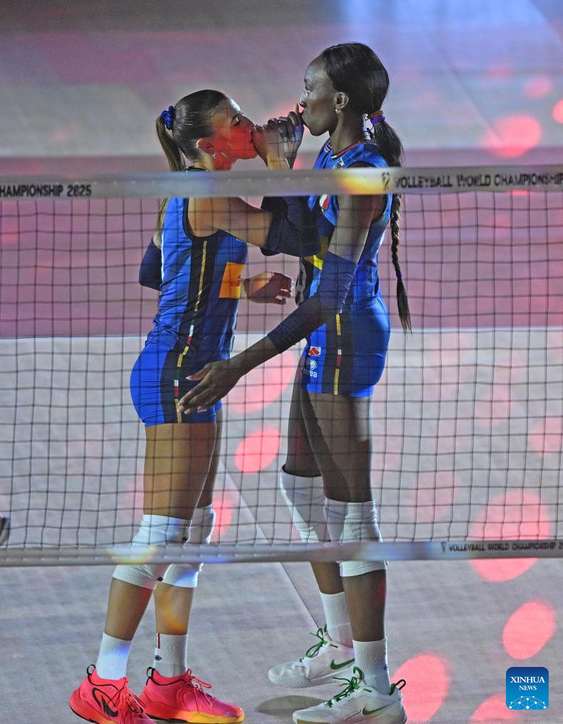 Alessia Orro (L) and Paola Ogechi Egonu of Italy react before the quarterfinal match between Italy and Poland at the Volleyball Women's World Championship in Bangkok, Thailand, Sept. 3, 2025. (Xinhua/Hou Zhaokang)