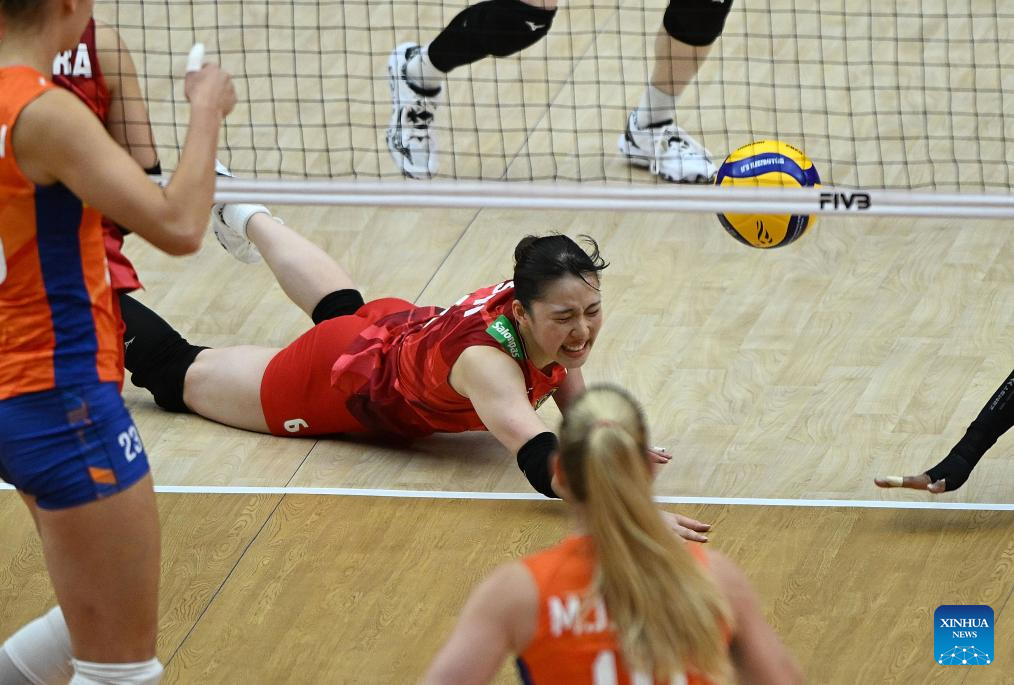 Nika Daalderop (L) of the Netherlands tries to save the ball during the quarterfinal match between the Netherlands and Japan at the Volleyball Women's World Championship in Bangkok, Thailand, Sept. 3, 2025. (Xinhua/Hou Zhaokang)