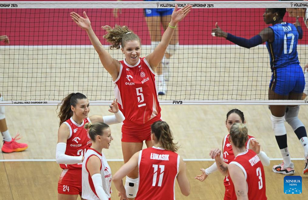 Agnieszka Korneluk (top) of Poland celebrates scoring with teammates during the quarterfinal match between Italy and Poland at the Volleyball Women's World Championship in Bangkok, Thailand, Sept. 3, 2025. (Xinhua/Hou Zhaokang)