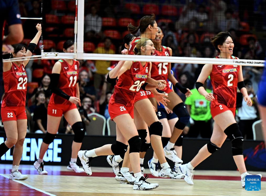 Players of Japan celebrate victory after the quarterfinal match between the Netherlands and Japan at the Volleyball Women's World Championship in Bangkok, Thailand, Sept. 3, 2025. (Xinhua/Hou Zhaokang)