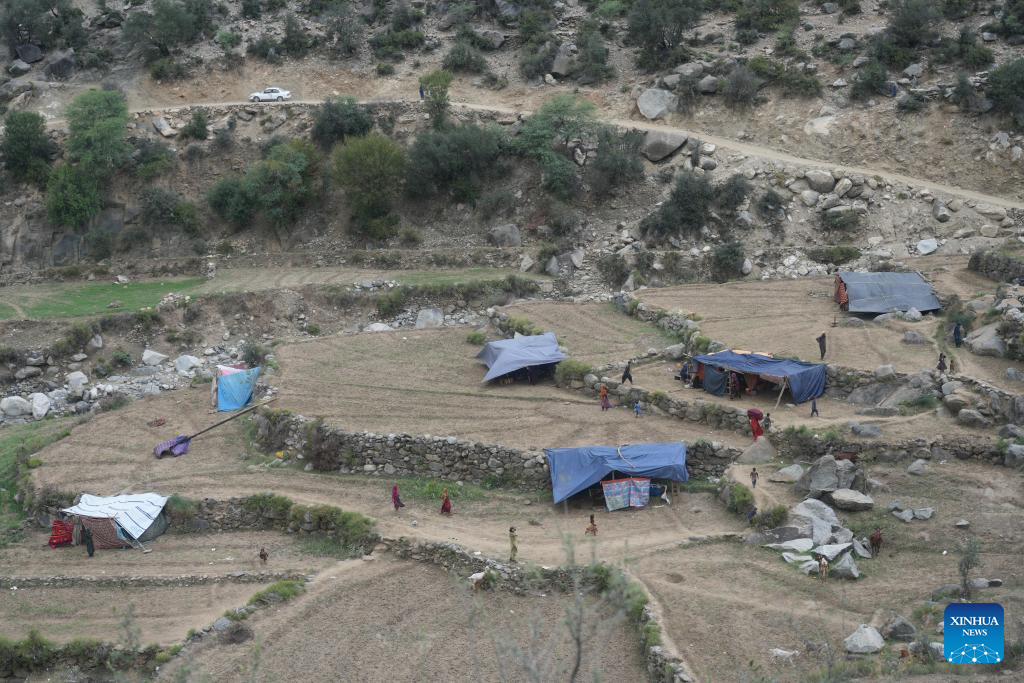 This photo taken on Sept. 3, 2025 shows a view of a makeshift post-earthquake shelter site in a valley of the Suki district in Kunar province, Afghanistan. The death toll from the powerful earthquake that struck eastern Afghanistan has climbed to 2,205, with 3,640 others injured, the Afghan Red Crescent Society reported Thursday. Rescue operations remain underway amid reports that many people are still trapped beneath the rubble of collapsed homes, the organization said. Tents have been set up for displaced families in several locations, while the organized distribution of emergency relief supplies is ongoing, Afghan interim government deputy spokesperson Hamdullah Fitrat said in a post on X. (Xinhua/Li Ang)