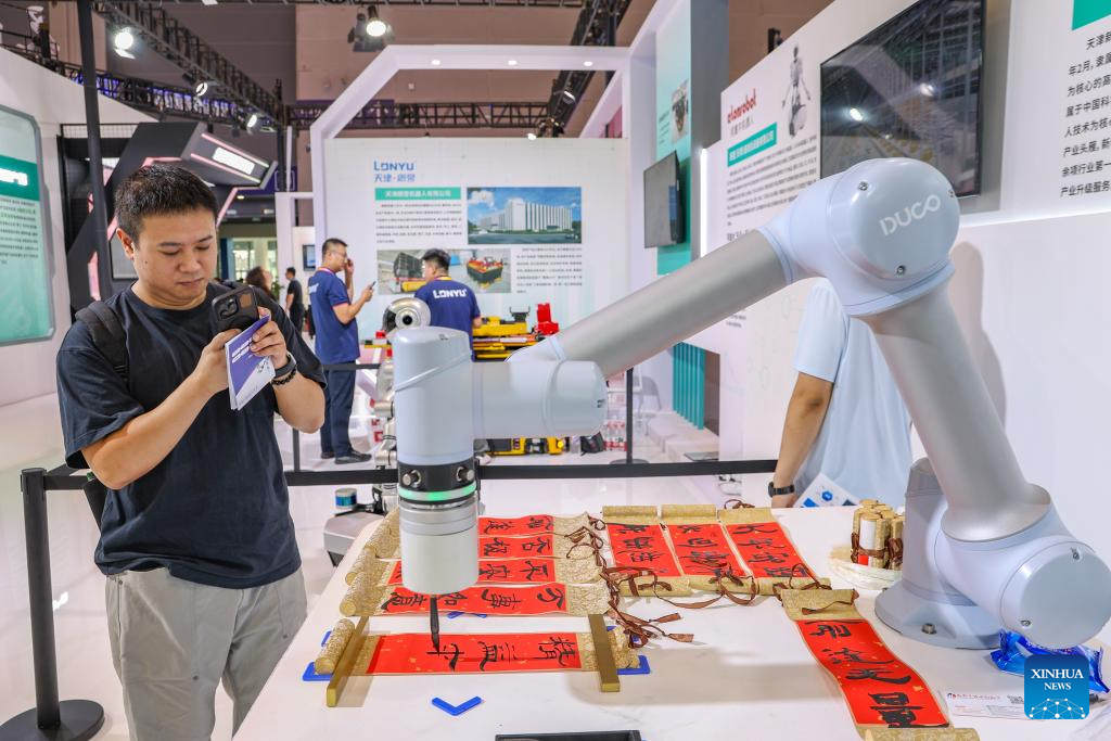 A robot demonstrates calligraphy skills during the World Smart Industry Expo 2025 in southwest China's Chongqing, Sept. 5, 2025. The World Smart Industry Expo 2025 kicked off on Friday in southwest China's Chongqing Municipality, bringing together more than 600 domestic and international businesses to showcase innovations across various sectors, including autonomous driving, smart homes and the low-altitude economy. (Xinhua/Huang Wei)
