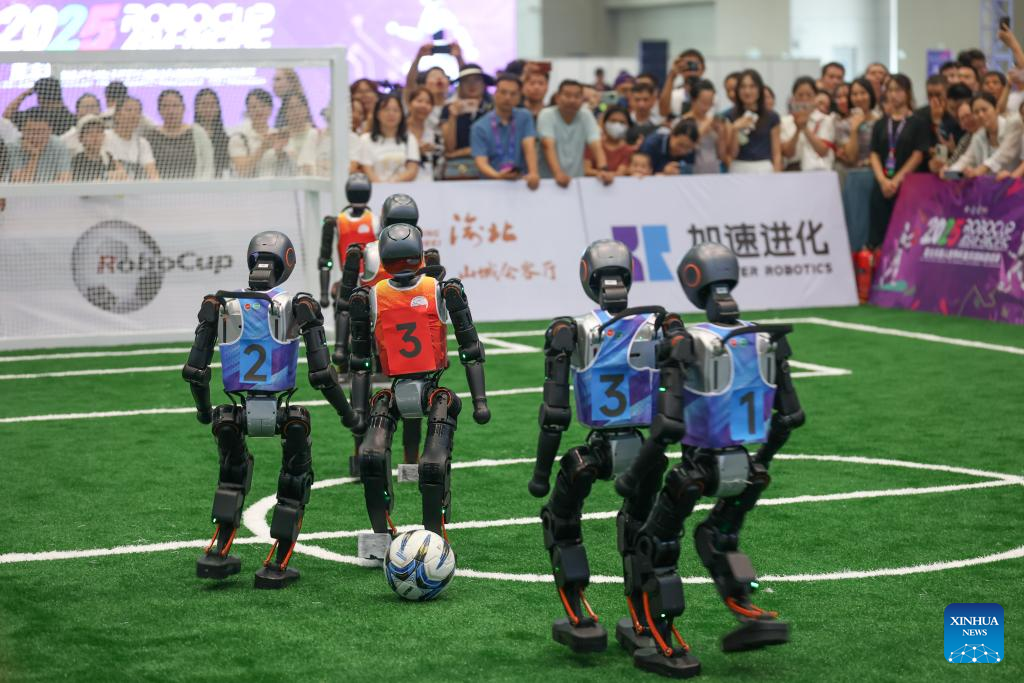 Robot players compete during a 3v3 robot football match at the World Smart Industry Expo 2025 in southwest China's Chongqing, Sept. 5, 2025. The World Smart Industry Expo 2025 kicked off on Friday in southwest China's Chongqing Municipality, bringing together more than 600 domestic and international businesses to showcase innovations across various sectors, including autonomous driving, smart homes and the low-altitude economy. (Xinhua/Chen Cheng)