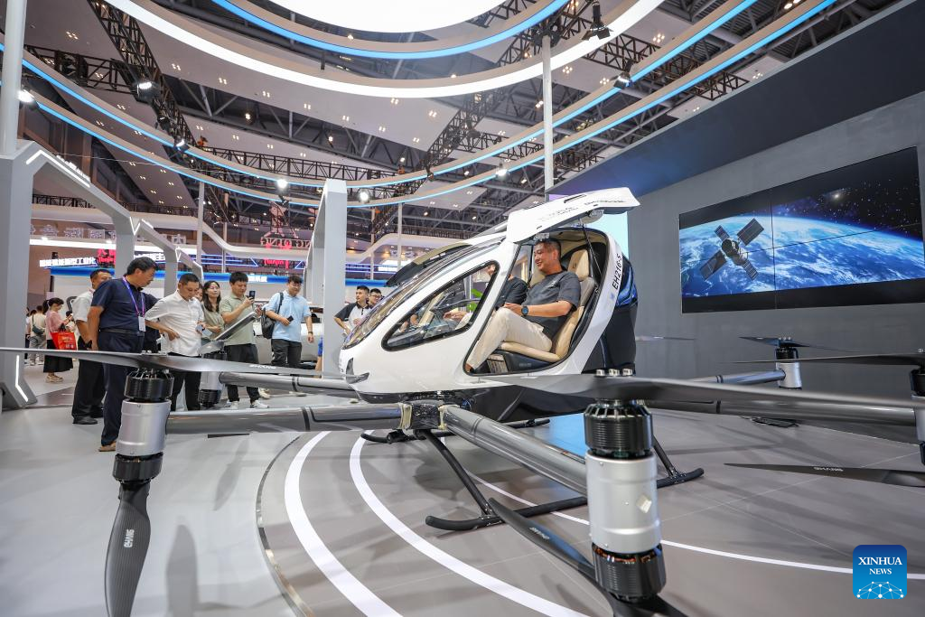 A visitor tries an electric vertical takeoff and landing (eVTOL) aircraft during the World Smart Industry Expo 2025 in southwest China's Chongqing, Sept. 5, 2025. The World Smart Industry Expo 2025 kicked off on Friday in southwest China's Chongqing Municipality, bringing together more than 600 domestic and international businesses to showcase innovations across various sectors, including autonomous driving, smart homes and the low-altitude economy. (Xinhua/Huang Wei)