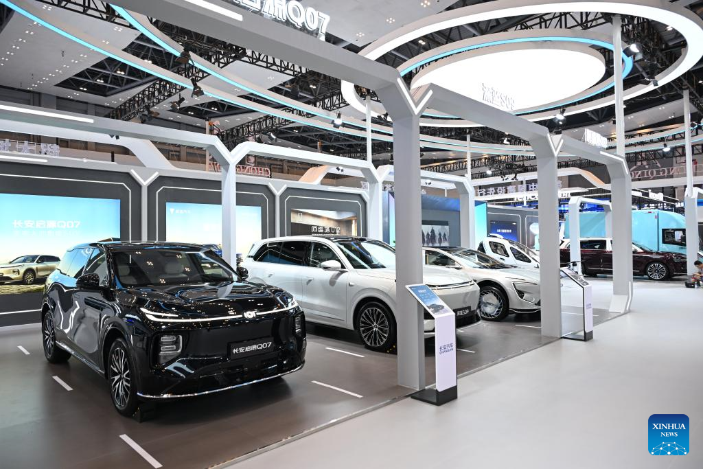 This photo taken on Sept. 4, 2025 shows new energy vehicles during the World Smart Industry Expo 2025 in southwest China's Chongqing Municipality.(Xinhua/Wang Quanchao)