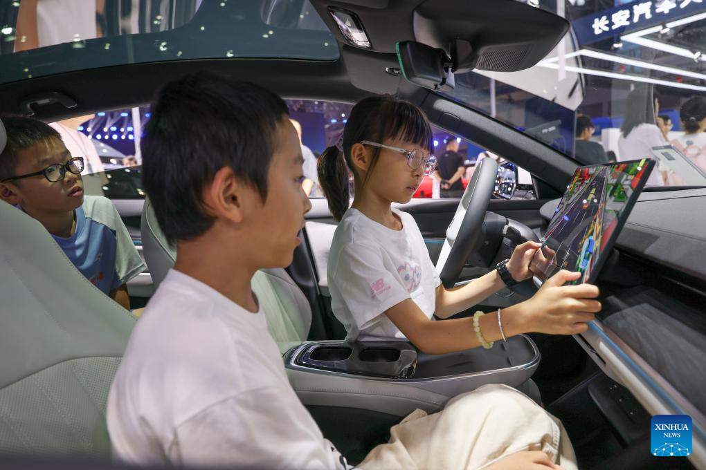Children play video games in a smart cockpit during the World Smart Industry Expo 2025 in southwest China's Chongqing Municipality, Sept. 6, 2025.(Xinhua/Chen Cheng)