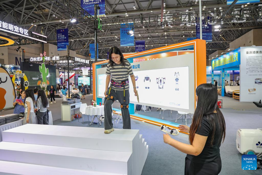 A visitor tries an exoskeleton robot during the World Smart Industry Expo 2025 in southwest China's Chongqing, Sept. 5, 2025. The World Smart Industry Expo 2025 kicked off on Friday in southwest China's Chongqing Municipality, bringing together more than 600 domestic and international businesses to showcase innovations across various sectors, including autonomous driving, smart homes and the low-altitude economy. (Xinhua/Huang Wei)