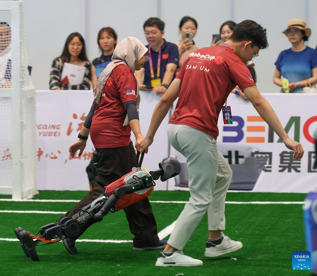 Staff members remove malfunctioning robots from the field during a 3v3 robot football match at the World Smart Industry Expo 2025 in southwest China's Chongqing, Sept. 5, 2025. The World Smart Industry Expo 2025 kicked off on Friday in southwest China's Chongqing Municipality, bringing together more than 600 domestic and international businesses to showcase innovations across various sectors, including autonomous driving, smart homes and the low-altitude economy. (Xinhua/Chen Cheng)