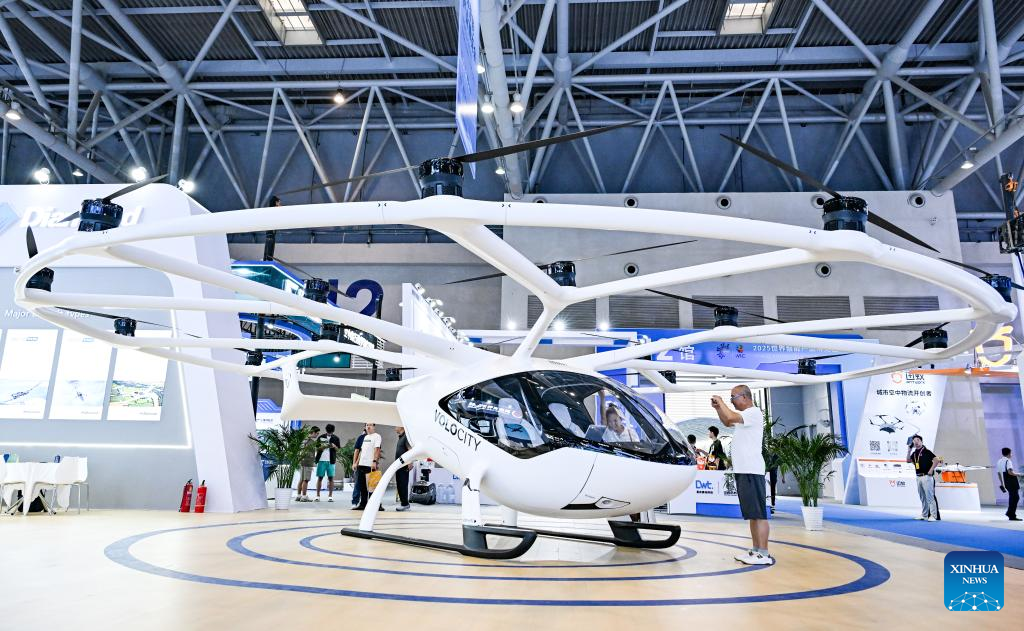 A visitor takes photos of an electric vertical take-off-and-landing (eVTOL) aircraft during the World Smart Industry Expo 2025 in southwest China's Chongqing, Sept. 5, 2025. The World Smart Industry Expo 2025 kicked off on Friday in southwest China's Chongqing Municipality, bringing together more than 600 domestic and international businesses to showcase innovations across various sectors, including autonomous driving, smart homes and the low-altitude economy. (Xinhua/Wang Quanchao)