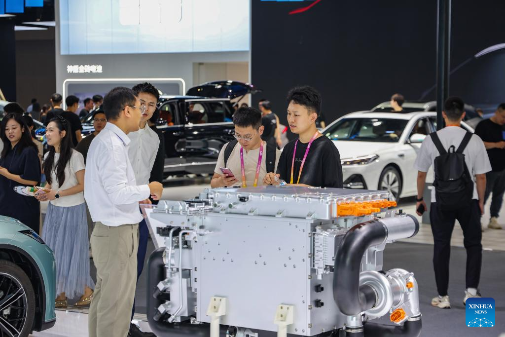 Visitors learn about the hydrogen power technology applied in new energy vehicles during the World Smart Industry Expo 2025 in southwest China's Chongqing Municipality, Sept. 5, 2025.(Xinhua/Huang Wei)