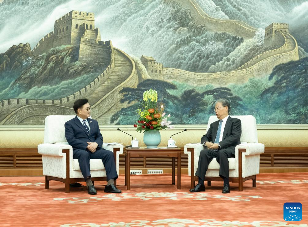Zhao Leji, chairman of the National People's Congress Standing Committee, meets with National Assembly Speaker of the Republic of Korea (ROK) Woo Won-shik in Beijing, capital of China, Sept. 4, 2025. Woo Won-shik is in China for commemorations marking the 80th anniversary of the victory in the Chinese People's War of Resistance against Japanese Aggression and the World Anti-Fascist War. (Xinhua/Ding Haitao)