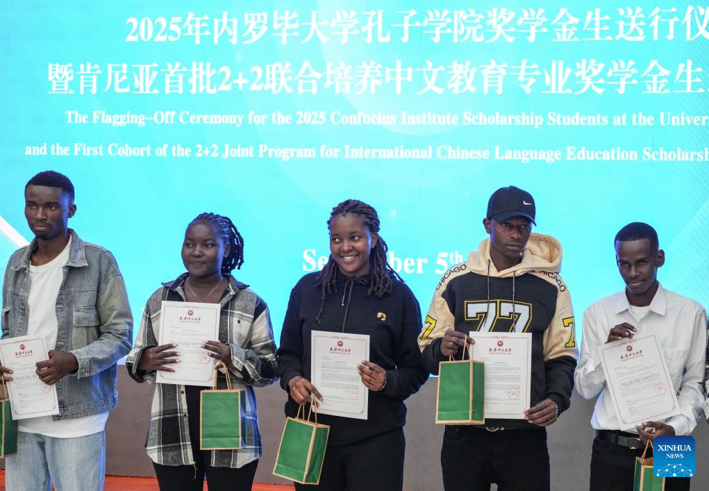 NAIROBI, Sept. 5 (Xinhua) -- A flag-off ceremony was held on Friday for scholarship students from the Confucius Institute at the University of Nairobi in Kenya, who are heading to Tianjin Normal University in China for advanced Mandarin (standard Chinese language) studies. Among them, 20 students will embark on a two-year study program in China.