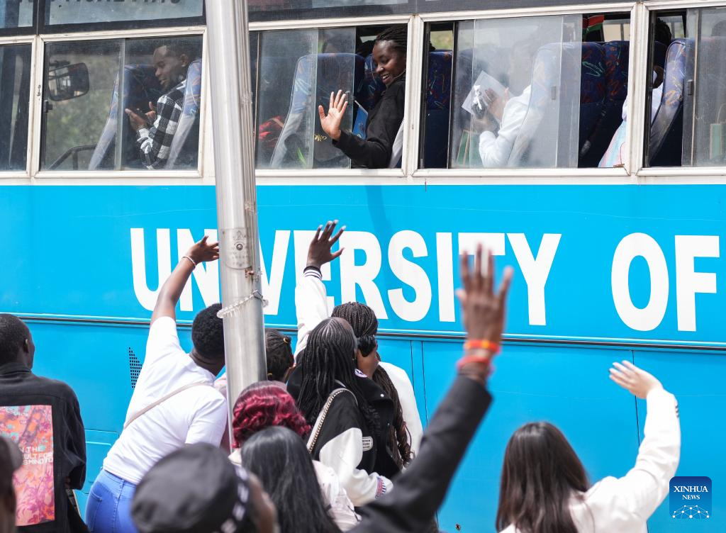 People wave goodbye to students who are heading to Tianjin Normal University in China for advanced Mandarin (standard Chinese language) studies, in Nairobi, Kenya, on Sept. 5, 2025. A flag-off ceremony was held on Friday for scholarship students from the Confucius Institute at the University of Nairobi in Kenya, who are heading to Tianjin Normal University in China for advanced Mandarin (standard Chinese language) studies. Among them, 20 students will embark on a two-year study program in China. (Xinhua/Li Yahui)