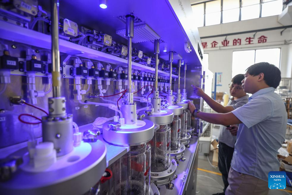 Workers test a medicine production equipment at a company in Ding'an Taling industrial park in Ding'an, south China's Hainan Province, Sept. 4, 2025. (Xinhua/Zhang Liyun)
