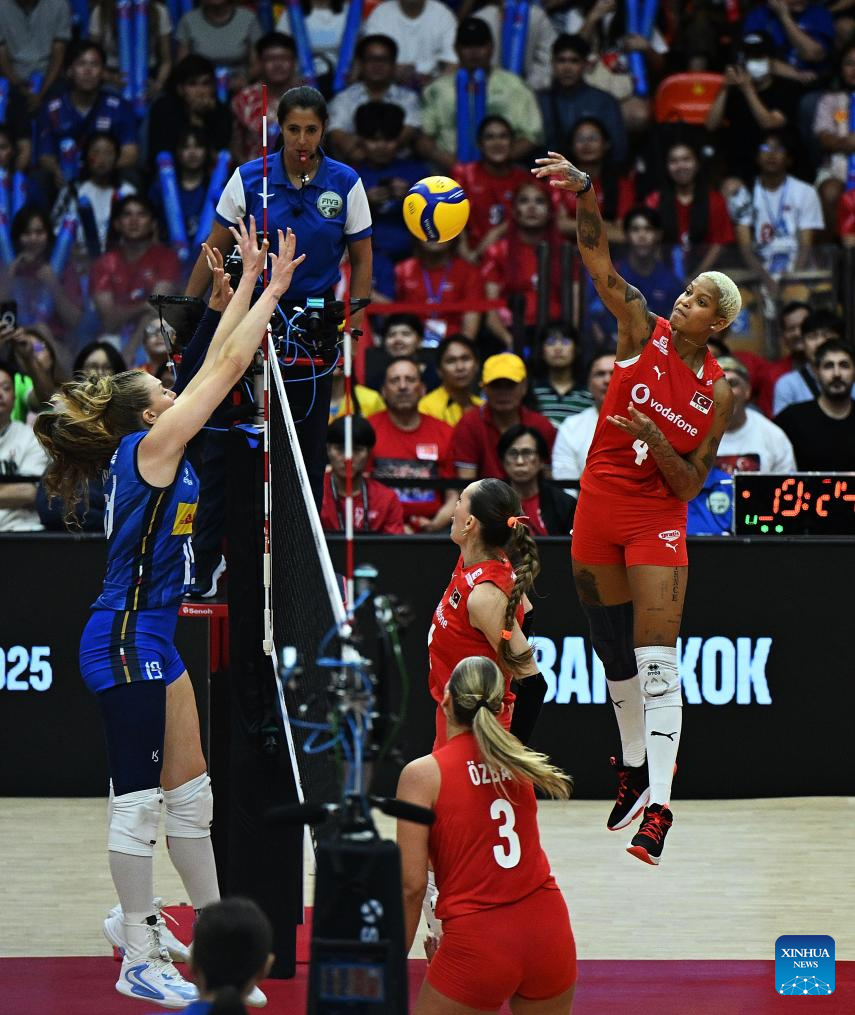 Melissa Teresa Vargas (1st R) of Türkiye spikes the ball during the final match between Türkiye and Italy at the Volleyball Women's World Championship in Bangkok, Thailand, Sept. 7, 2025. (Xinhua/Hou Zhaokang)