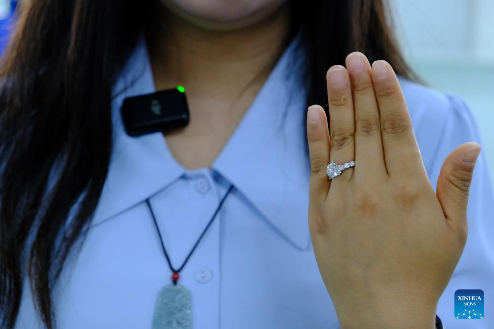 Gao Shuhui, administrative director of Carbon Research Chips Material (Xinjiang) Technology Co., Ltd., displays a ring set with a two-carat lab-grown diamond at a factory in Kashgar, northwest China's Xinjiang Uygur Autonomous Region, Aug. 12, 2025. (Xinhua/Tan Yixiao)