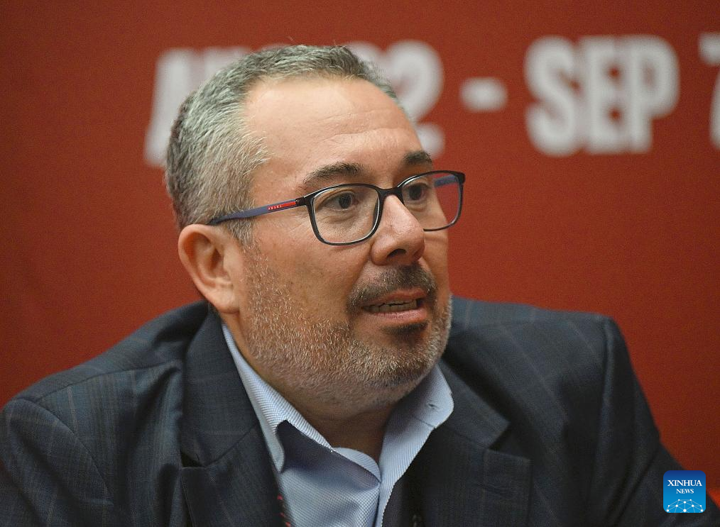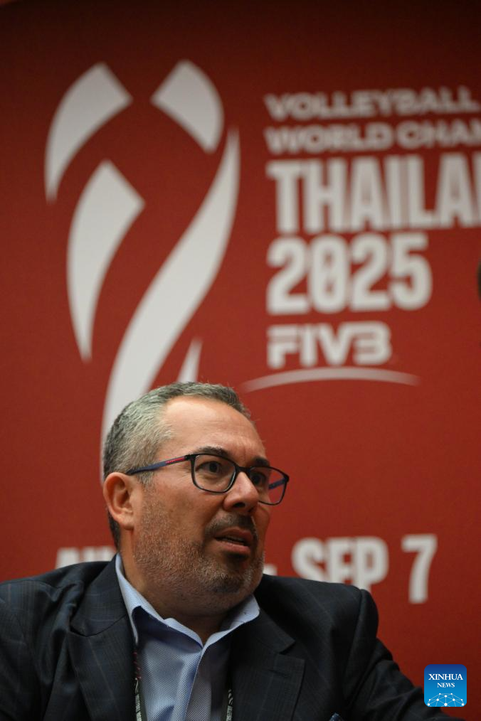 FIVB President Fabio Azevedo receives an interview with Xinhua News Agency in Bangkok, Thailand, Sept. 4, 2025. (Xinhua/Hou Zhaokang)