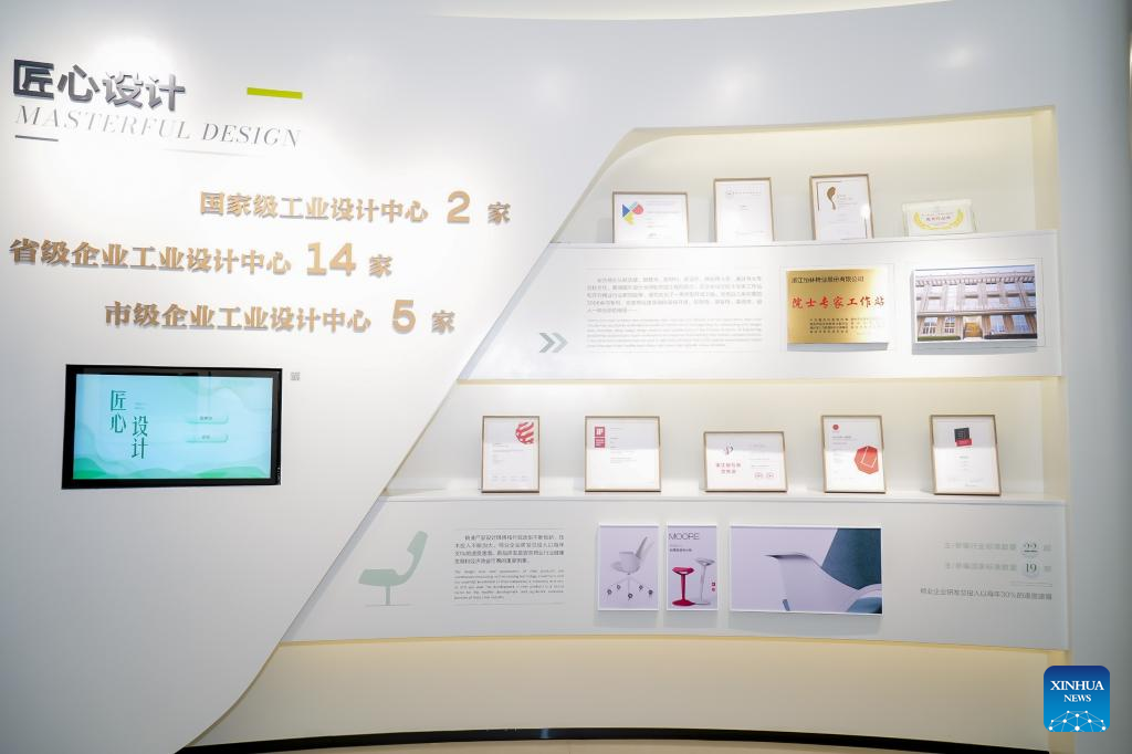 This photo shows a brief introduction of Anji's chair-making industry at the "green home industrial park" in Anji County, east China's Zhejiang Province, Aug. 29, 2025. (Xinhua)