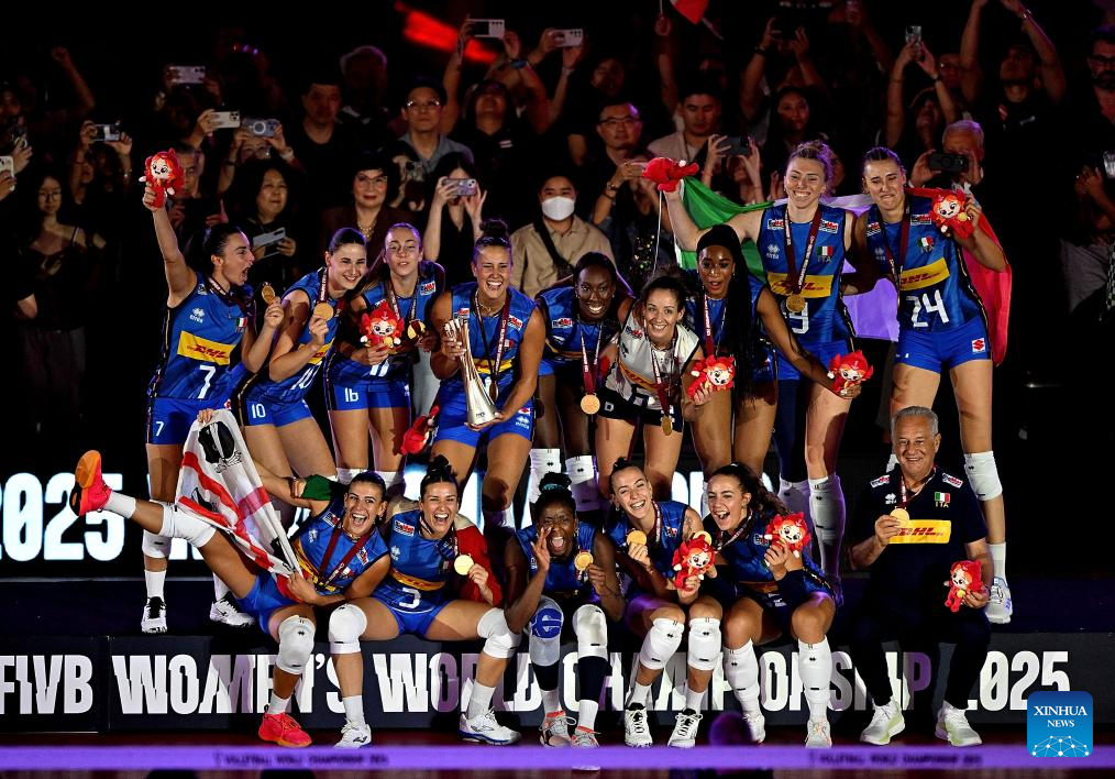 Team Italy celebrate during the awarding ceremony after the final match between Türkiye and Italy at the Volleyball Women's World Championship in Bangkok, Thailand, Sept. 7, 2025. (Xinhua/Sun Weitong)