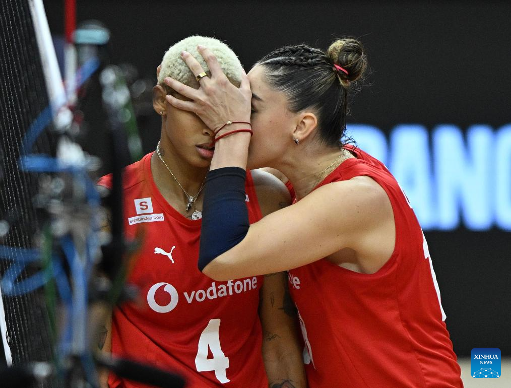 Players of Türkiye celebrate scoring during the final match between Türkiye and Italy at the Volleyball Women's World Championship in Bangkok, Thailand, Sept. 7, 2025. (Xinhua/Sun Weitong)