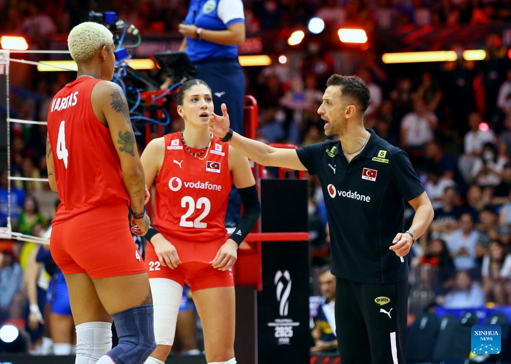 Daniele Santarelli (R), head coach of Türkiye, instructs players during the final match between Türkiye and Italy at the Volleyball Women's World Championship in Bangkok, Thailand, Sept. 7, 2025. (Xinhua/Sun Weitong)