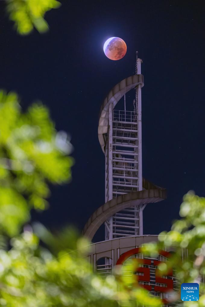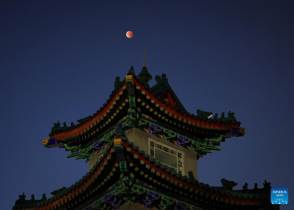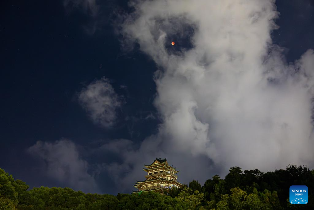 The moon is seen during a lunar eclipse in the sky over a bell tower in Nanjing, east China's Jiangsu Province, Sept. 8, 2025. A "red moon" was witnessed in many parts of the world during a total lunar eclipse started from Sunday night.