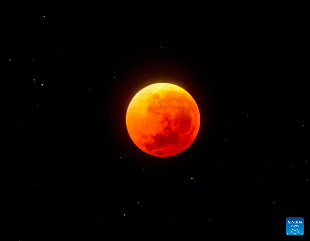 The moon is seen during a lunar eclipse in the sky over Daqing City, northeast China's Heilongjiang Province, Sept. 8, 2025. A "red moon" was witnessed in many parts of the world during a total lunar eclipse started from Sunday night.