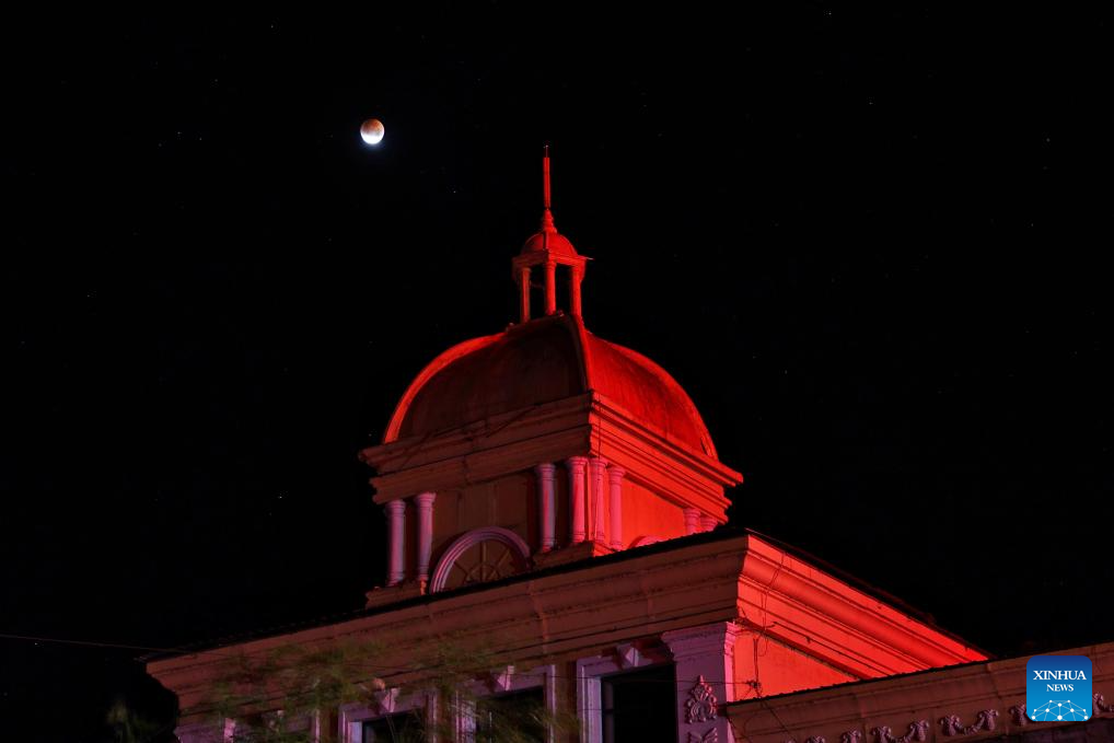 The moon is seen during a lunar eclipse in the sky over Mengzi City, southwest China's Yunnan Province, Sept. 8, 2025. A "red moon" was witnessed in many parts of the world during a total lunar eclipse started from Sunday night.