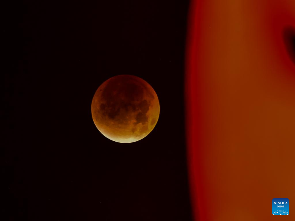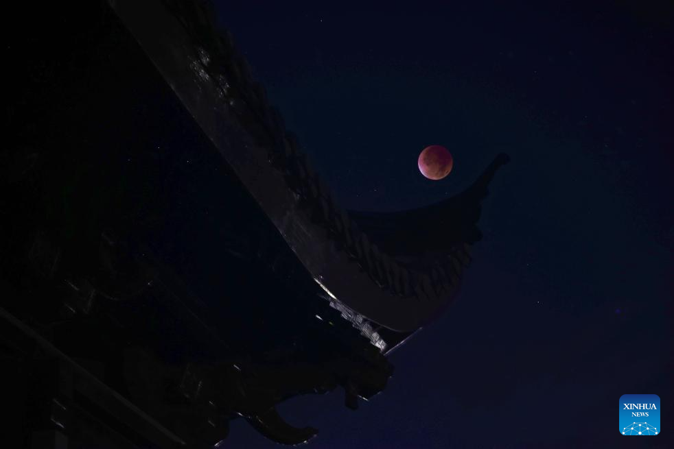A total lunar eclipse occurs when the moon and the sun are on exact opposite sides of the Earth. (Photo by Shen Yiqing/Xinhua)