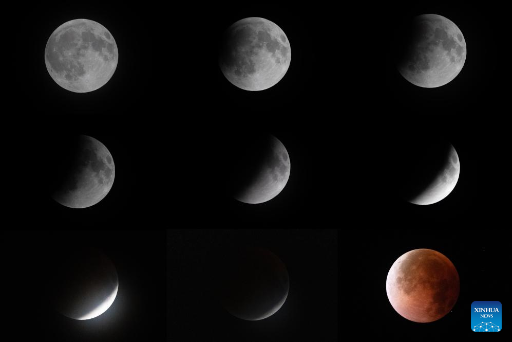 This combo photo taken from Sept. 7 to 8, 2025 shows a lunar eclipse over Nagqu, southwest China's Xizang Autonomous Region. A "red moon" was witnessed in many parts of the world during a total lunar eclipse started from Sunday night.