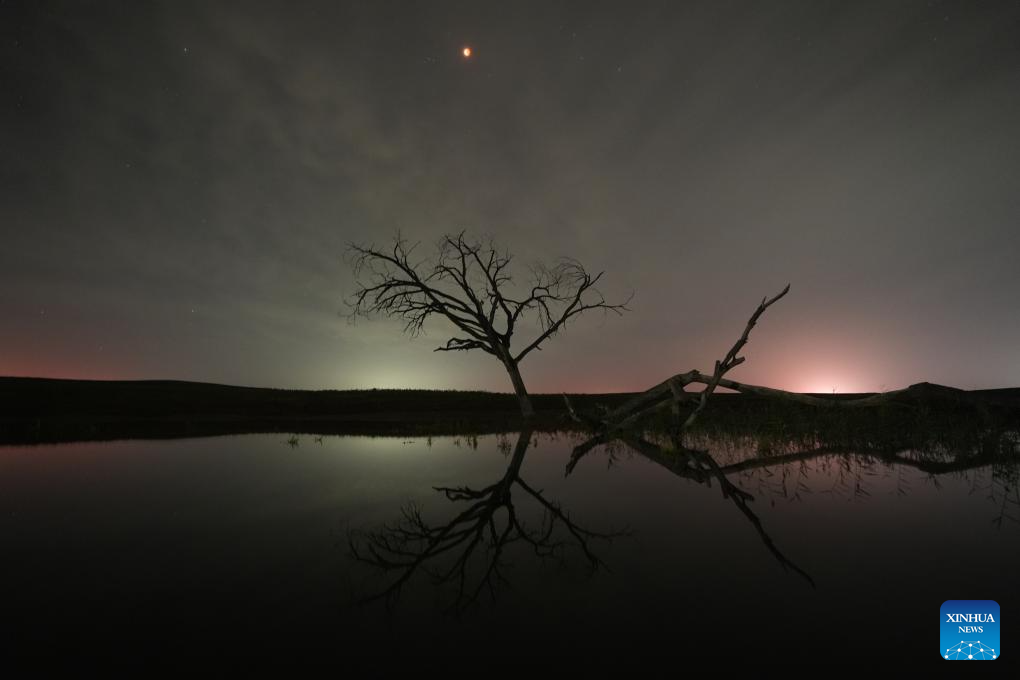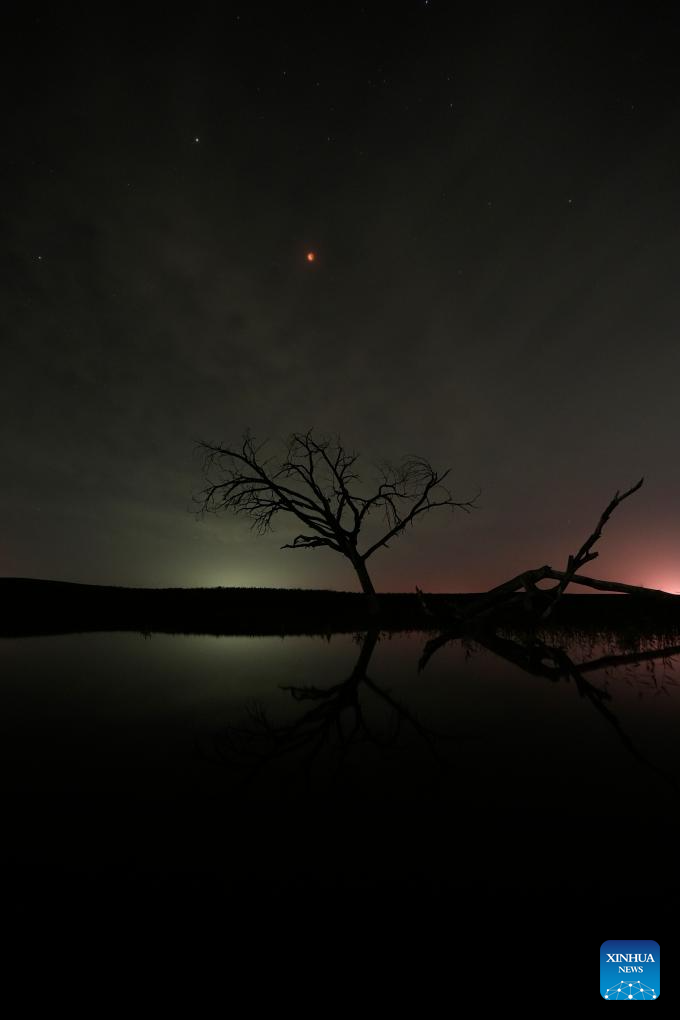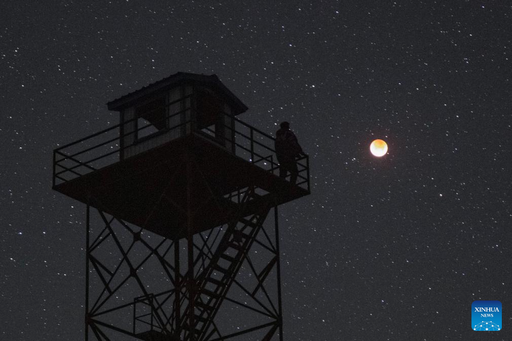 The moon is seen during a lunar eclipse in the sky over Fengjigou Township of Yanchi County in Wuzhong City, northwest China's Ningxia Hui Autonomous Region, Sept. 8, 2025. A "red moon" was witnessed in many parts of the world during a total lunar eclipse started from Sunday night.