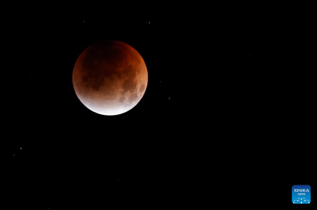 The moon is seen during a lunar eclipse in the sky over Tongjiang City, northeast China's Heilongjiang Province, Sept. 8, 2025. A "red moon" was witnessed in many parts of the world during a total lunar eclipse started from Sunday night.