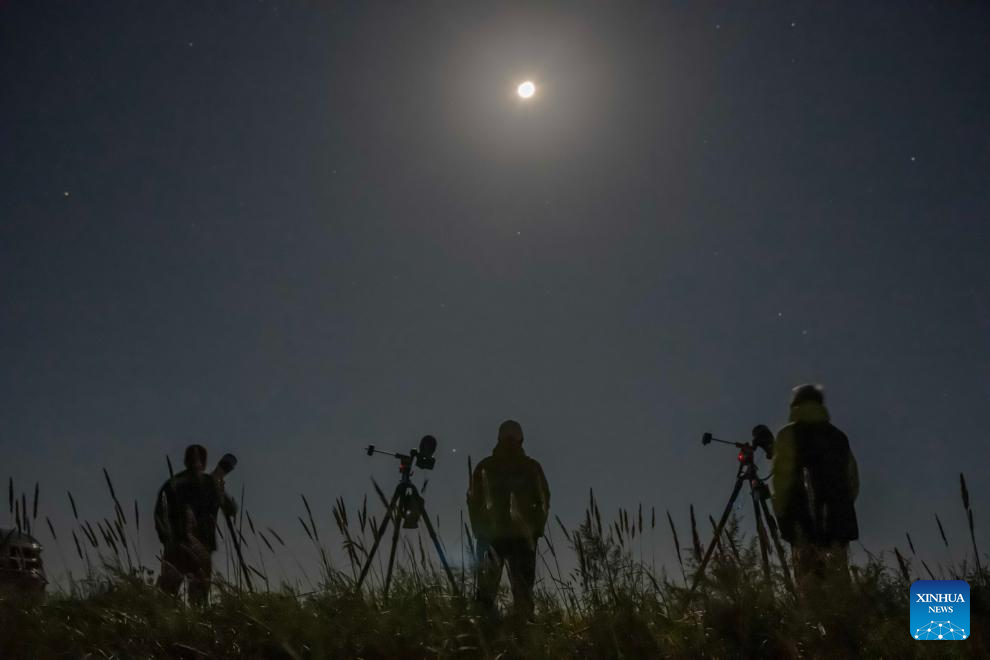 Photography enthusiasts take photos of the moon during a lunar eclipse in the sky over Qiqihar, northeast China's Heilongjiang Province, Sept. 8, 2025. A "red moon" was witnessed in many parts of the world during a total lunar eclipse started from Sunday night.