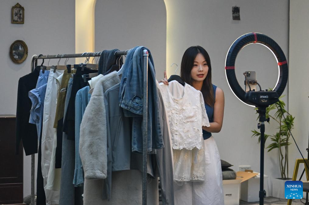 A livestreamer sells clothes in Tianmen City, central China's Hubei Province, Aug. 27, 2025. (Xinhua/Du Zixuan)
