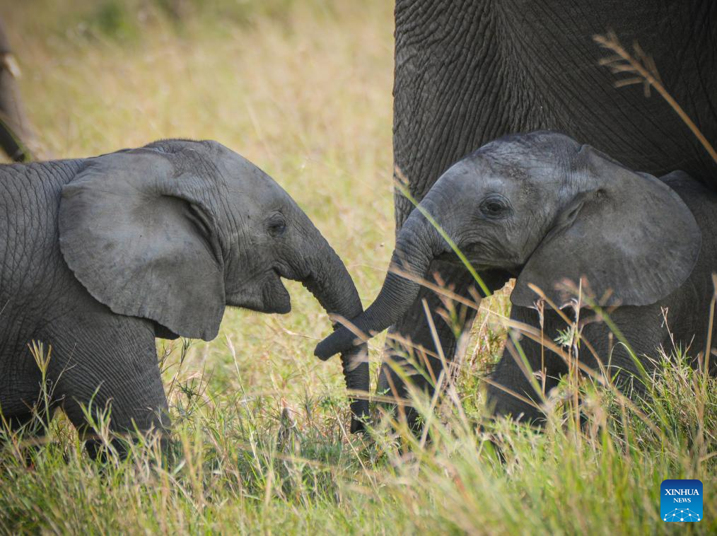 Two baby elephants play in the Masai Mara National Reserve in Kenya, on Sept. 7, 2025. Kenya's southwestern county of Narok is home to the world's famous Masai Mara National Reserve where tourists flock to during the country's peak tourism season from July through October to watch the wildebeest migration.